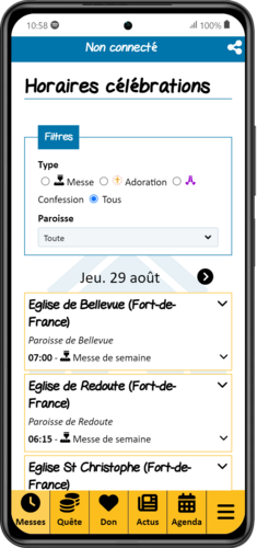 Acceptez la géolocalisation, et consultez les horaires des messes, adorations, confessions, etc. du plus proche au plus éloigné de vous. Le fidèle peut aussi rechercher directement la paroisse qui l'intéresse via le moteur de recherche.